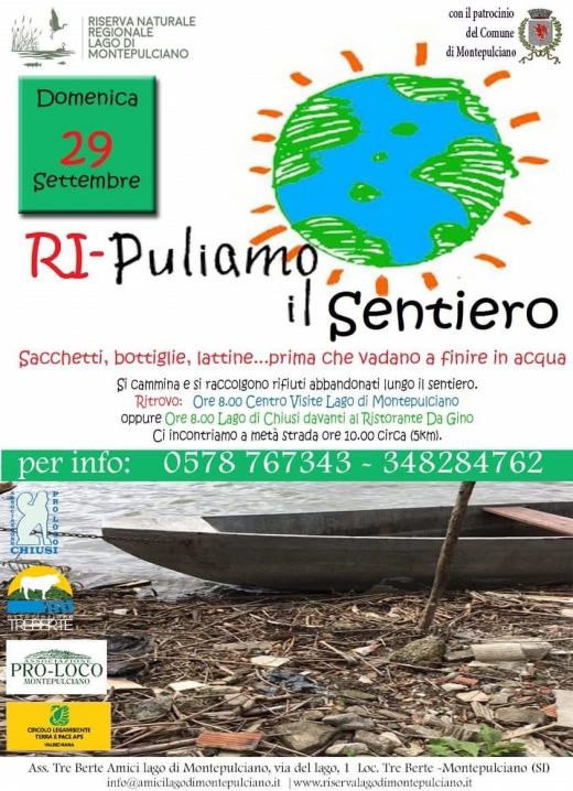 La Pro Loco di Montepulciano, insieme alla Pro Loco Chiusi Legambiente e Amici del Lago di Montepulciano invitano tutti Domenica 29 Settembre all'appuntamento Ri-puliamo il sentiero della Bonifica. Sarà un momento importante di incontro tra diverse realtà locali, utile a confrontarsi su eventi e iniziative future nonché un modo per portare avanti una buona abitudine di vita.